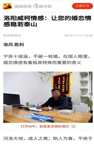 近日,洛阳威柯情感先后被今日头条、凤凰新闻、 搜狐新闻、都市头条等媒体所报 道或转发。